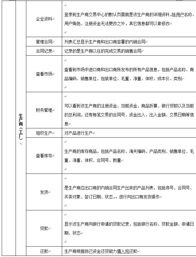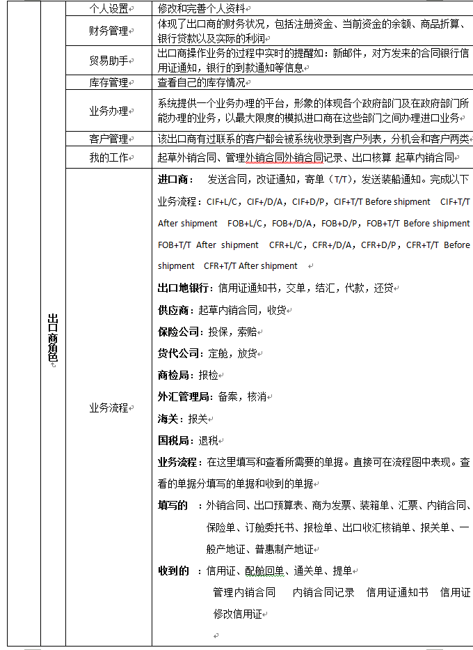 7、可以配置(zhi)進口商(shang)、出(chu)口商(shang)、進口地銀(yin)(yin)行(xing)(xing)、出(chu)口地銀(yin)(yin)行(xing)(xing)、國稅局(ju)(ju)、海(hai)關、商(shang)檢局(ju)(ju)、保(bao)險公(gong)司、貨代公(gong)司、外(wai)匯管理局(ju)(ju)等相關參數(shu)和業(ye)務,在實訓過(guo)程中可以分組、分角(jiao)色進行(xing)(xing)互動、交(jiao)互式訓練。角(jiao)色扮演:出(chu)口商(shang)、進口商(shang)、生產商(shang)(工廠)、進口銀(yin)(yin)行(xing)(xing)、出(chu)口銀(yin)(yin)行(xing)(xing)、保(bao)險公(gong)司、商(shang)檢局(ju)(ju)、海(hai)關、外(wai)匯管理局(ju)(ju)、貨代、國稅局(ju)(ju)