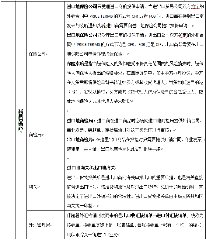 出口(kou)商、進(jin)口(kou)商、生產商(工廠)、進(jin)口(kou)銀(yin)行、出口(kou)銀(yin)行、保險公司、商檢(jian)局、海關、外(wai)匯(hui)管理(li)局、貨(huo)代、國(guo)稅局