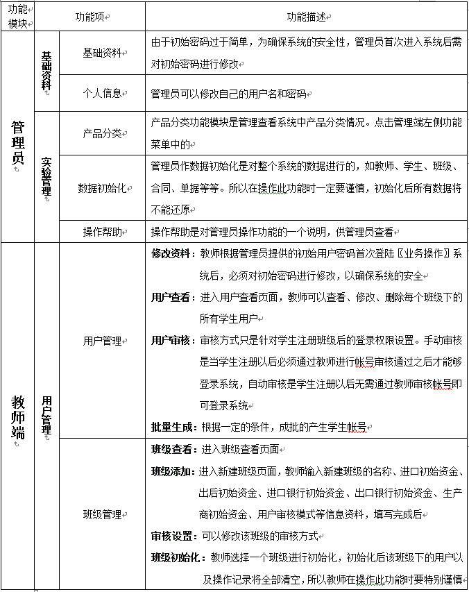 教師(shi)為參加實(shi)習(xi)的(de)(de)學生(sheng)分配角色,設定實(shi)習(xi)評分標準、實(shi)時監控(kong)學生(sheng)的(de)(de)操(cao)作,并且對于模擬貿易中發(fa)(fa)(fa)生(sheng)的(de)(de)糾紛進行仲裁,最終利用評分系統(tong)對學生(sheng)的(de)(de)實(shi)習(xi)成果(guo)給予評定,教師(shi)通過在網(wang)站發(fa)(fa)(fa)布新聞、調整(zheng)(zheng)商(shang)品成本(ben)和(he)價格、調整(zheng)(zheng)匯率、業務費(fei)(fei)用、海運費(fei)(fei)、保險費(fei)(fei)率及(ji)突發(fa)(fa)(fa)事(shi)件的(de)(de)發(fa)(fa)(fa)生(sheng)概(gai)率等方式對國際貿易環境實(shi)施宏觀(guan)調控(kong),讓學生(sheng)在實(shi)習(xi)中充(chong)分發(fa)(fa)(fa)揮主(zhu)觀(guan)能(neng)動性