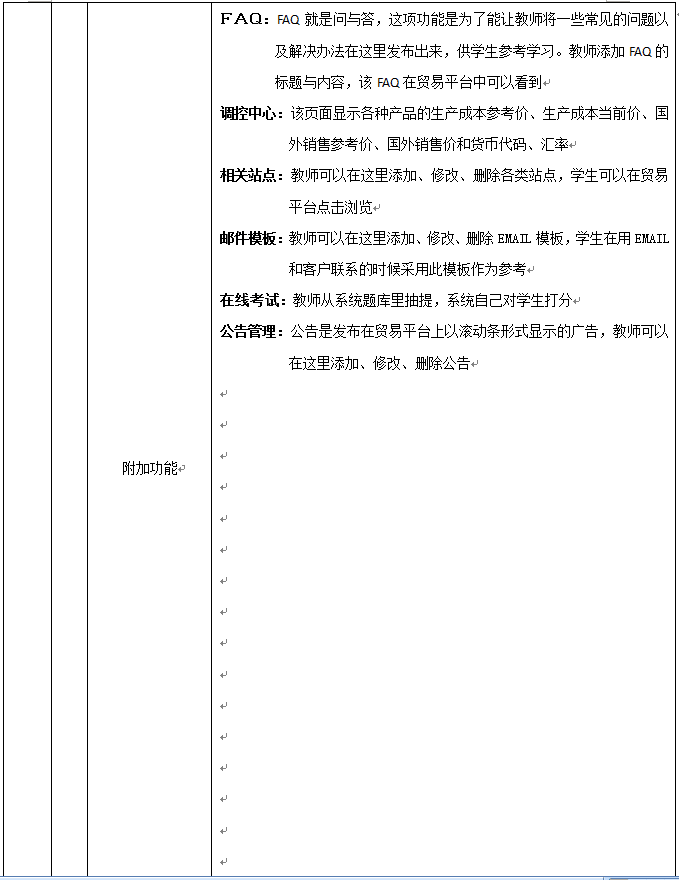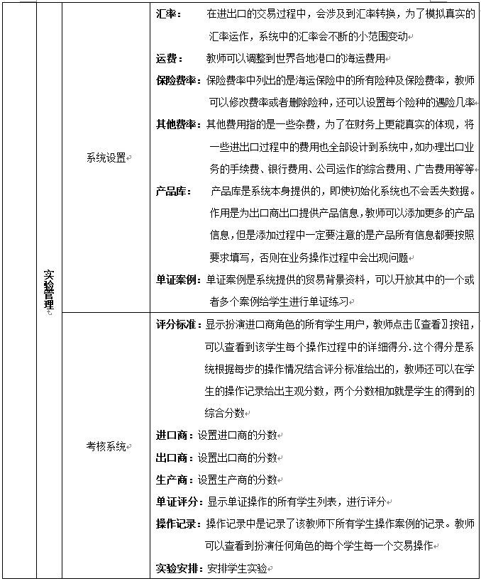8、教師(shi)為參加實(shi)(shi)(shi)習的(de)(de)學生(sheng)(sheng)分(fen)(fen)配角色(se),設定實(shi)(shi)(shi)習評分(fen)(fen)標準、實(shi)(shi)(shi)時監(jian)控學生(sheng)(sheng)的(de)(de)操作,并且對(dui)于模擬貿(mao)易(yi)中(zhong)發生(sheng)(sheng)的(de)(de)糾紛(fen)進行仲裁,最終利用評分(fen)(fen)系(xi)統(tong)對(dui)學生(sheng)(sheng)的(de)(de)實(shi)(shi)(shi)習成(cheng)果給予評定,教師(shi)通過在(zai)網站發布新聞、調(diao)整商品成(cheng)本(ben)和(he)價格、調(diao)整匯率、業(ye)務費(fei)(fei)用、海運費(fei)(fei)、保險費(fei)(fei)率及突發事(shi)件(jian)的(de)(de)發生(sheng)(sheng)概(gai)率等(deng)方(fang)式對(dui)國(guo)際貿(mao)易(yi)環境實(shi)(shi)(shi)施宏觀調(diao)控,讓學生(sheng)(sheng)在(zai)實(shi)(shi)(shi)習中(zhong)充分(fen)(fen)發揮主(zhu)觀能動性(xing)