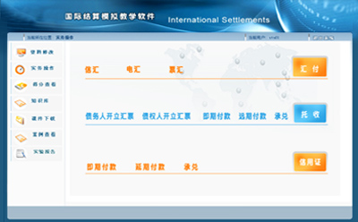 《思(si)沃國(guo)際(ji)結(jie)算模擬(ni)(ni)實(shi)訓(xun)系統》從(cong)高(gao)校國(guo)際(ji)結(jie)算教(jiao)學(xue)的(de)實(shi)際(ji)需求出發,主(zhu)要從(cong)匯(hui)付、托收(shou)、信用證三種不同類型的(de)結(jie)算方式,本教(jiao)學(xue)平臺軟件逼真地模擬(ni)(ni)了出口(kou)商(shang)、進口(kou)商(shang)、匯(hui)入行、匯(hui)出行等(deng)角色的(de)辦事流程。