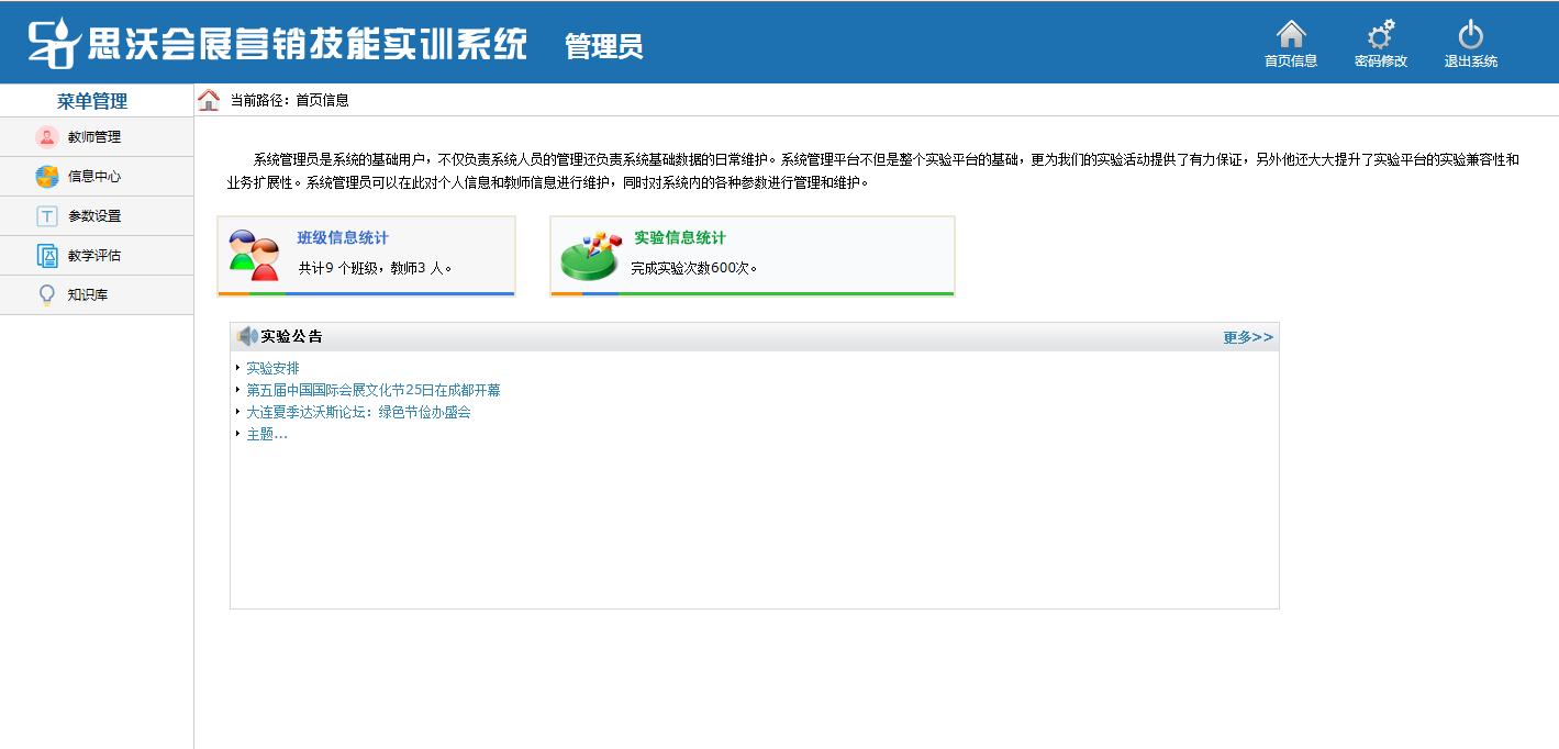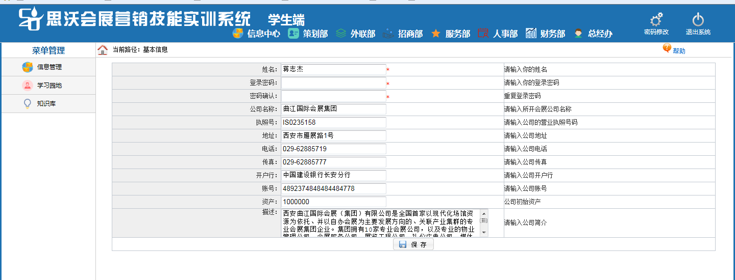思沃(wo)會展(zhan)(zhan)營(ying)銷模擬實(shi)(shi)訓系統以模擬會展(zhan)(zhan)公司的(de)(de)(de)(de)策劃部(bu)、外聯部(bu)、招(zhao)商(shang)部(bu)、會展(zhan)(zhan)服(fu)務(wu)部(bu)、人事(shi)部(bu)、財務(wu)部(bu)以及總經辦7大業務(wu)部(bu)門為(wei)基礎(chu)而展(zhan)(zhan)開實(shi)(shi)驗(yan)操(cao)作的(de)(de)(de)(de)。該教學(xue)(xue)平臺(tai)軟(ruan)件業務(wu)內(nei)容包括了:項目(mu)上報審(shen)(shen)批、項目(mu)的(de)(de)(de)(de)策劃安排、服(fu)務(wu)商(shang)管(guan)理(li)、人事(shi)招(zhao)聘(pin)與管(guan)理(li)、會展(zhan)(zhan)的(de)(de)(de)(de)現(xian)場服(fu)務(wu)與合同管(guan)理(li)等等,讓(rang)學(xue)(xue)生通過實(shi)(shi)驗(yan)感受會展(zhan)(zhan)項目(mu)的(de)(de)(de)(de)系統化管(guan)理(li)流程與業務(wu)操(cao)作內(nei)容,不但能夠了解(jie)會展(zhan)(zhan)項目(mu)從立項審(shen)(shen)批到策劃、宣(xuan)傳、招(zhao)展(zhan)(zhan)招(zhao)商(shang)、現(xian)場服(fu)務(wu)以及會后(hou)總結各(ge)(ge)(ge)個環節的(de)(de)(de)(de)業務(wu),同時還可以掌(zhang)握各(ge)(ge)(ge)種文案的(de)(de)(de)(de)寫作技(ji)巧,從而讓(rang)學(xue)(xue)生真正的(de)(de)(de)(de)理(li)解(jie)并掌(zhang)握會展(zhan)(zhan)這(zhe)一行業的(de)(de)(de)(de)各(ge)(ge)(ge)種知識與業務(wu)要求。為(wei)學(xue)(xue)生以后(hou)的(de)(de)(de)(de)工作、學(xue)(xue)習提供(gong)了一個實(shi)(shi)戰演練的(de)(de)(de)(de)實(shi)(shi)訓平臺(tai),增強(qiang)了學(xue)(xue)生進入工作崗位后(hou)的(de)(de)(de)(de)實(shi)(shi)力。