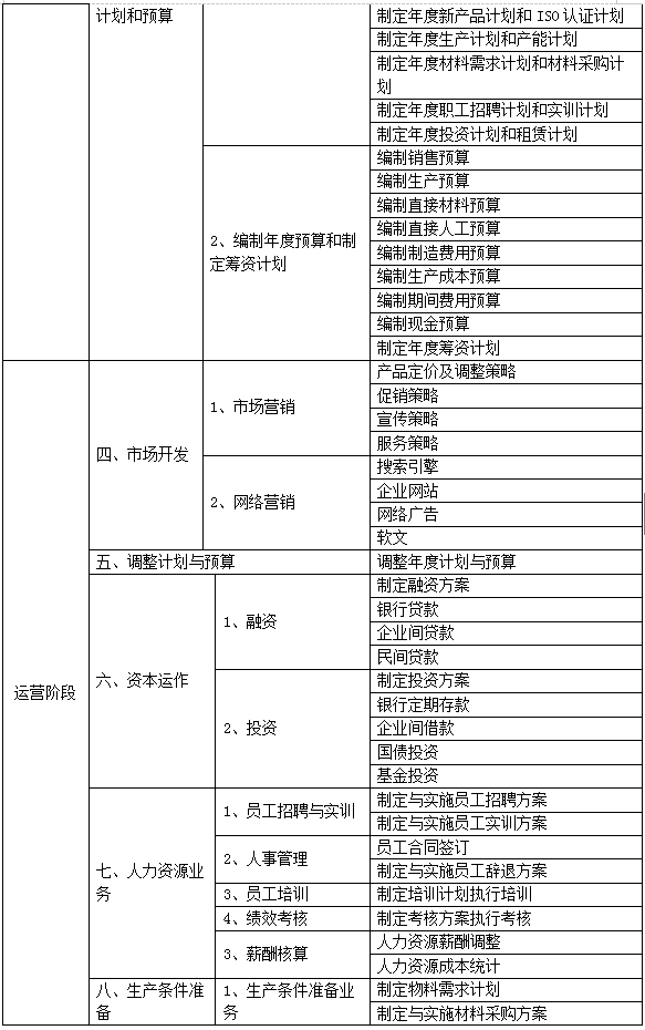 跨專業(ye)(ye)(ye)平臺主要由搭(da)建(jian)平臺運(yun)行環境、制造企業(ye)(ye)(ye)運(yun)營(ying)、行政業(ye)(ye)(ye)務(wu)和金融業(ye)(ye)(ye)務(wu)等幾大(da)(da)部(bu)(bu)(bu)(bu)分組成(cheng)。以現代(dai)制造行業(ye)(ye)(ye)為藍本,設置總經(jing)理(li)辦(ban)(ban)(ban)公(gong)(gong)(gong)室、銷(xiao)售部(bu)(bu)(bu)(bu)、生產部(bu)(bu)(bu)(bu)、采購(gou)部(bu)(bu)(bu)(bu)、倉儲部(bu)(bu)(bu)(bu)、外貿部(bu)(bu)(bu)(bu)、市場部(bu)(bu)(bu)(bu)、財務(wu)部(bu)(bu)(bu)(bu)、人(ren)才(cai)資源部(bu)(bu)(bu)(bu)、企業(ye)(ye)(ye)投資融部(bu)(bu)(bu)(bu)等十大(da)(da)制造企業(ye)(ye)(ye)職能部(bu)(bu)(bu)(bu)門;真(zhen)實模擬(ni)行政辦(ban)(ban)(ban)事(shi)部(bu)(bu)(bu)(bu)門,提供(gong)工(gong)商局(ju)、稅(shui)務(wu)局(ju)、會計事(shi)務(wu)所、銀(yin)行、物流、保險公(gong)(gong)(gong)司(si)(si)(si)、貸(dai)代(dai)公(gong)(gong)(gong)司(si)(si)(si)等辦(ban)(ban)(ban)事(shi)場所;系(xi)統虛擬(ni)扮演公(gong)(gong)(gong)安(an)局(ju)、質量與技術監督局(ju)、勞動與社(she)會保障局(ju)、原材(cai)料供(gong)應(ying)商、海關、商檢、外匯管(guan)理(li)局(ju)、船(chuan)公(gong)(gong)(gong)司(si)(si)(si)等服(fu)務(wu)性部(bu)(bu)(bu)(bu)門行業(ye)(ye)(ye)。攘括了與制造行業(ye)(ye)(ye)有(you)(you)關的所有(you)(you)相(xiang)關行政辦(ban)(ban)(ban)事(shi)部(bu)(bu)(bu)(bu)門和服(fu)務(wu)性行業(ye)(ye)(ye)。